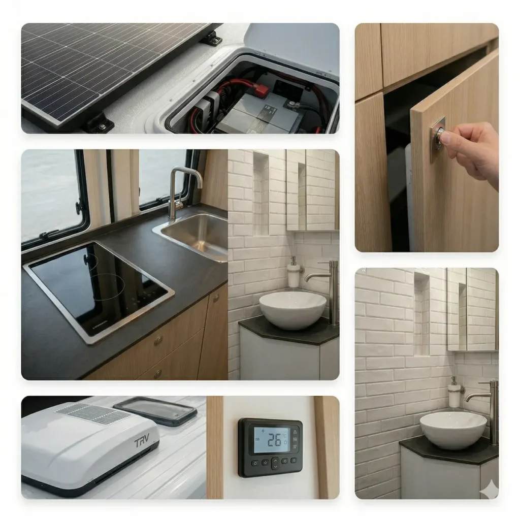 A diferencia de los estándares del mercado, nosotros integramos energía solar, climatización eficiente y mobiliario a medida, utilizando los mejores componentes adaptados específicamente a la estructura de tu vehículo.